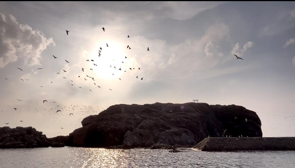 ※写真が経島。小さな鳥居がありますー現在はウミネコ繁殖地として国の天然記念物に指定されています。